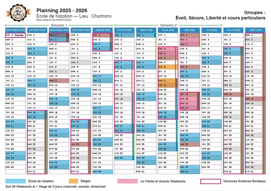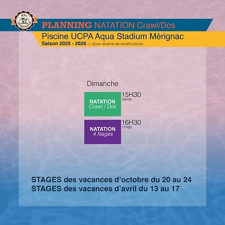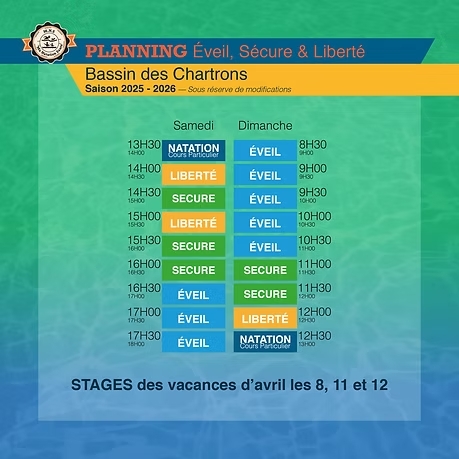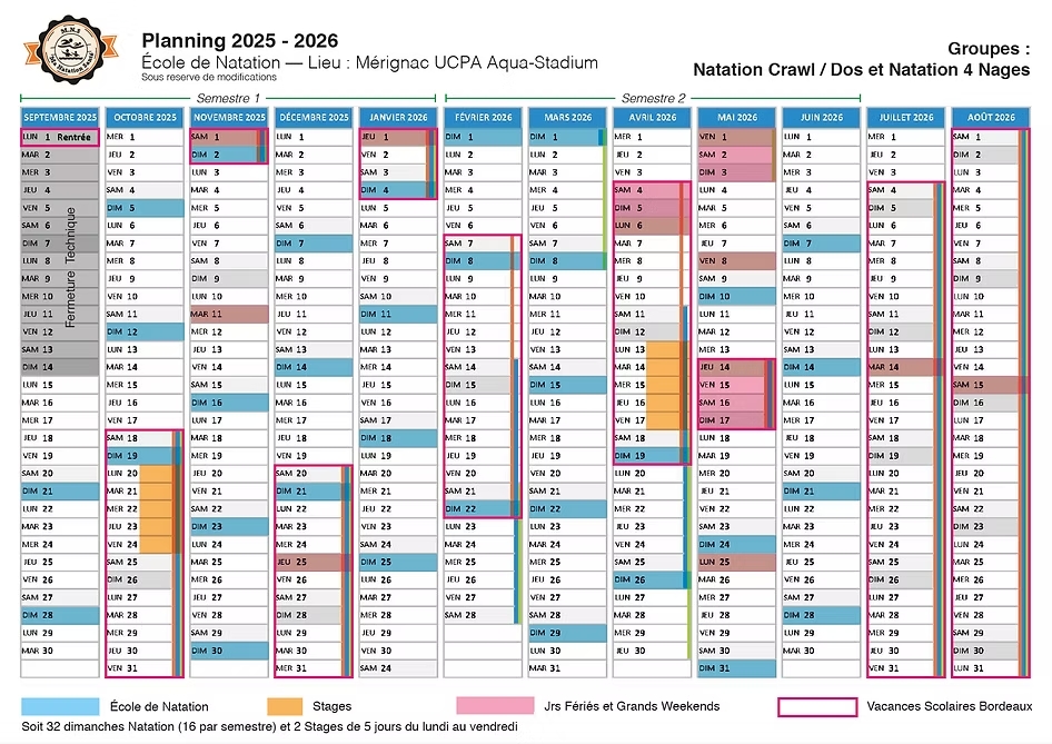 Retrouvez le planning prévisionnel annuel de l’école de natation pour chaque piscine afin de pouvoir organiser et prévoir au mieux vos séances et stages.